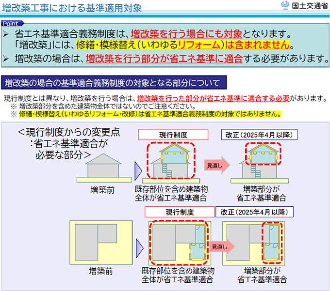 紋別市 秀研不動産 このページをシェア 木造戸建の ”大規模なリフォーム” は建築確認が必要です 一般的に中古住宅をリフォームするときは依頼主様(建築主)の依頼に応じる建築業者様(建築士を含みます。)が必要に応じて、リフォーム内容の可否や確認申請の要否を市町村または北海道の建築指導係等に確認することになります。このページは国土交通省が作成した資料のうち分りやすい図と画像だけを抜粋し、簡潔にしたものです。 ■建築確認が不要のリフォームや修繕でも建築基準法に適合させる必要があります。■令和7年4月から‟脱炭素社会の実現に資するための建築物のエネルギー消費性能の向上に関する法律等の一部を改正する法律” により全ての新築・非住宅に省エネ基準適合が義務付けされました。(略称:改正建築物省エネ法 概要:既存建築物でも修繕やリフォームを除く増改築は、増改築を行う部分を省エネ基準に適合させる必要があります。)後記「増改築工事における基準適用対象」参照【免責事項】1.媒介業者が建築確認の要否や当該建築の法適合状況を判定するものではありません。2.建築確認の要否等は国土交通省の指針と具体的な建築計画を審査・判定する建築行政の見解が異なることも予想されます。3.各種法令や建築確認の要否等は将来変更されることがあります。 中古住宅を購入するときに知っておきたい基本的知識・建築基準法で定める “木造戸建の大規模なリフォームに該当しないリフォーム” または “木造平屋(延床面積200㎡以下)の大規模なリフォーム” は建築確認が不要とされています。・建築確認の要否に対する考え方は国土交通省が様々な資料をインターネットに公開しています。 ”大規模なリフォーム” に該当するか否かにつきましては、次のフローチャートと画像事例をご参照ください。ただし建築確認の要否は建築行政が審査・判定します。 大規模なリフォームとは?建築基準法の大規模の修繕・模様替にあたるもので、建築物の主要構造部(壁・柱・床・はり・屋根または階段)の一種以上について行う過半の改修等を指します。※過半とは半分を超えること。 建築確認が不要な木造戸建のリフォーム例 建築確認手続きの要否について検討が必要なリフォーム例 増改築工事における基準適用対象 検査済証がない建築物と法改正詳しくはこちら → Q&A:検査済証が無い建築物と法改正 紋別市 秀研不動産 このページをシェア