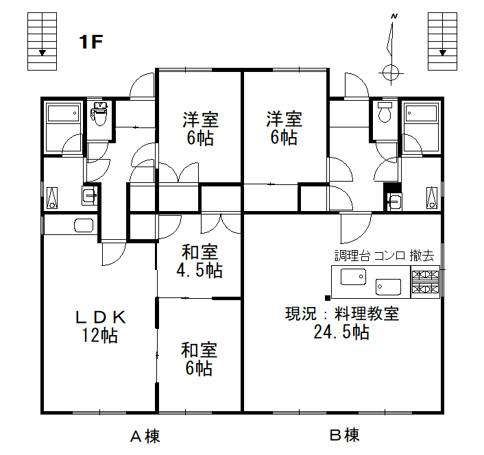 | 間取/駐車場 | A棟:1F3LDK入居中(年間家賃収入50万4000円)、2F3LDK:R7年3月より空室・入居者募集停止中 B棟:1F料理教室 空室・2F3LDK:R7年6月より空室・入居者募集停止中 駐車場:有(未舗装) |