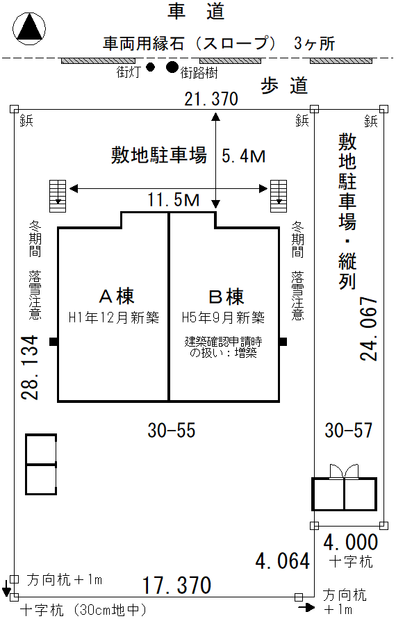 建築確認 | A棟新築:確認済証(旧確認通知書・建築図面)の保有:有、検査済証の保有:有 B棟増築:確認済証(旧確認通知書・建築図面)の保有:有、検査済証の保有:無 未検査 |