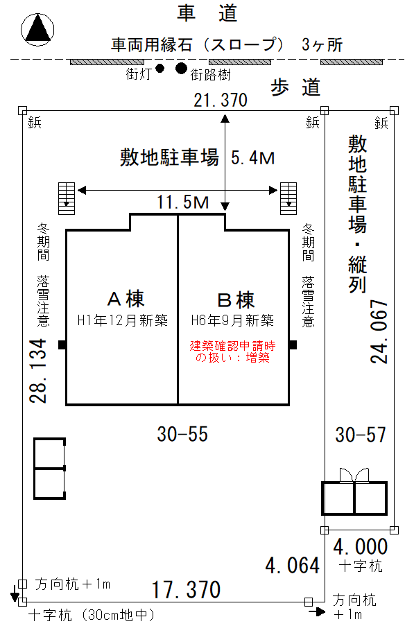 | 建築確認 | A棟新築:確認済証(旧確認通知書・建築図面)の保有:有、検査済証の保有:有 B棟増築:確認済証(旧確認通知書・建築図面)の保有:有、検査済証の保有:無 未検査 |